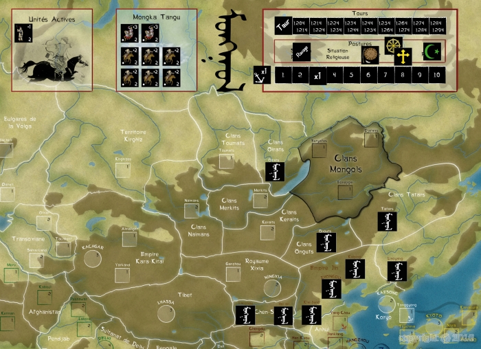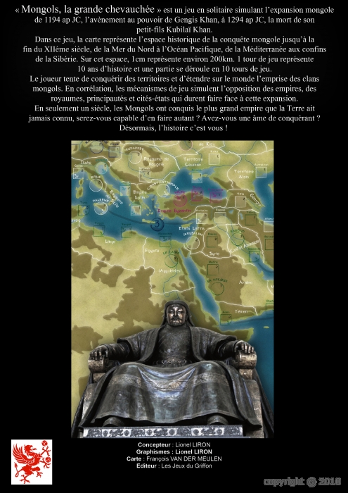 "Mongols, la grande chevauchée" est un jeu en solitaire simulant l'expansion mongole de 1194 ap JC, l'avénement au pouvoir de Gengis Khan, à 1294 ap JC, la mort de son petit-fils Kubilaï Khan.