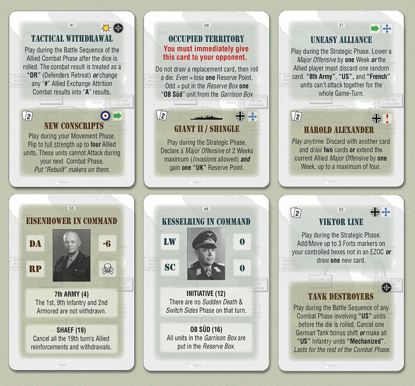 To make the play surface more easy to use, the long Italian peninsula will be represented by a series of separate maps each showing a part of the battleground. As the frontline moves north or south, players will switch the “play map” map to show the actual areas of operations, thus saving a lot of table space. It will also be possible under certain circumstances for players to actually change sides in the game (keeping their accumulated Victory points): Thus both will be able to get the chance to be on the “attacking side” if wished for; historically the Germans were mostly on the defensive. The Event card system will also be changed a bit, with each card allowing multiple possible effects/events: all the cards will be useful, even when the main event cannot be used because of Strategic Initiative.