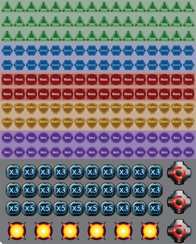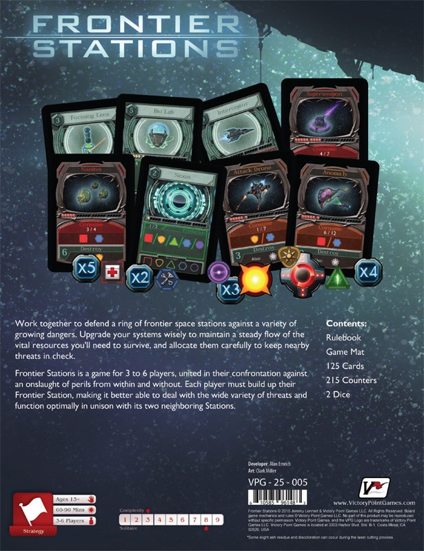 Frontier Stations, from Jeremy Lennert, is a game for 3 to 6 players working together to confront an onslaught of perils. Each player must build up their station, making it better able to deal with the wide variety of threats and function optimally with its two neighboring stations.