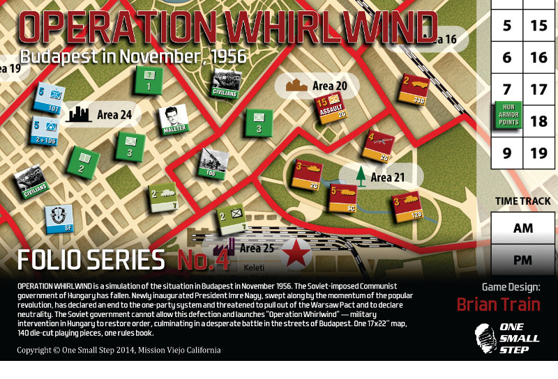 OPERATION WHIRLWIND is a simulation of the situation in Budapest in November 1956. The Soviet-imposed Communist government of Hungary has fallen. Newly inaugurated President Imre Nagy, swept along by the momentum of the popular revolution, has declared an end to the one-party system and threatened to pull out of the Warsaw Pact and to declare neutrality. The Soviet government cannot allow this defection and launches "Operation Whirlwind" ― military intervention in Hungary to restore order, culminating in a desperate battle in the streets of Budapest.