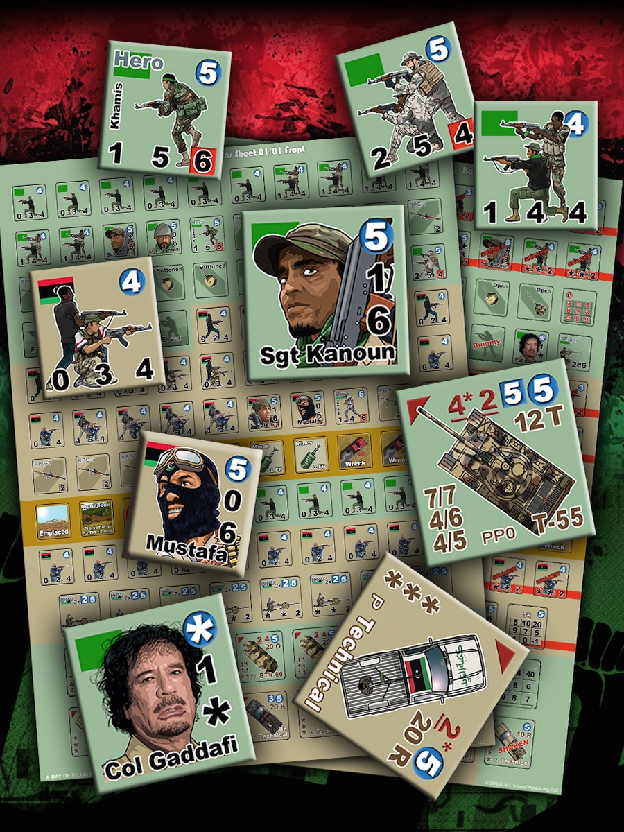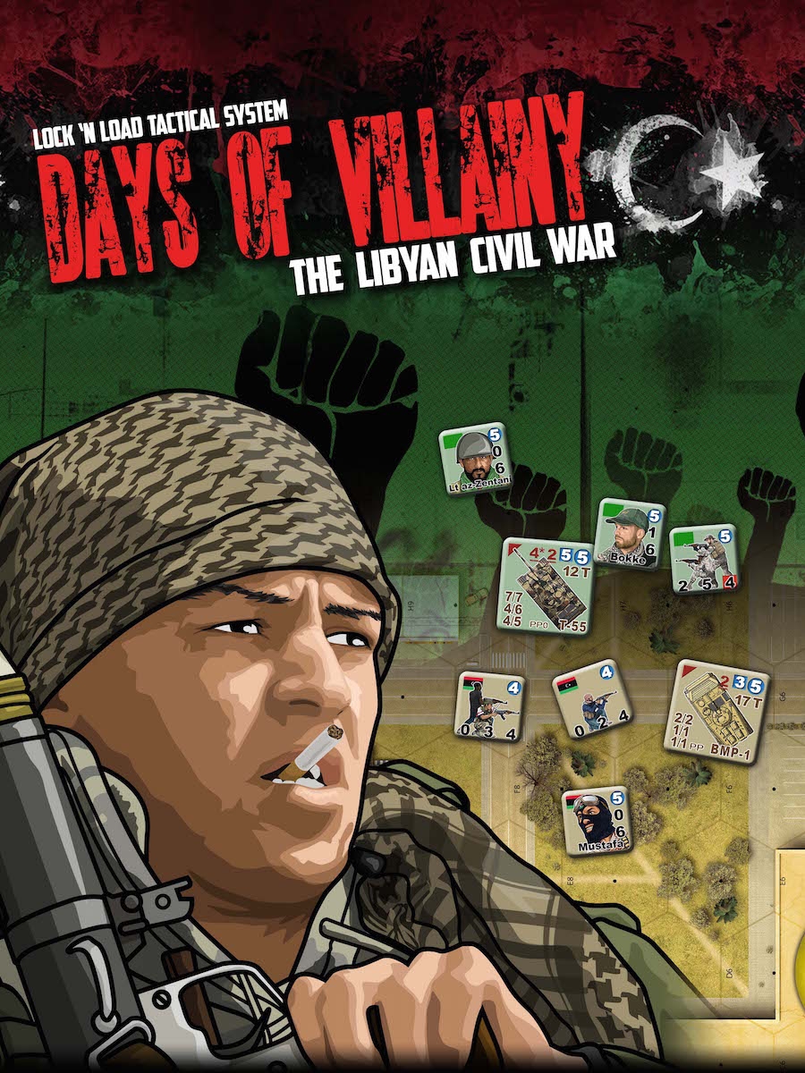 Days of Villainy is a expansion that can be played with ANY core/base games of the Lock 'n Load Tactical series. Days of Villainy depicts four of the fierce battles that occurred during the Libyan Civil War, including Colonel Gaddafi’s final epic confrontation. Both sides are loaded for bear, armed with RPG-7s and FN MAG and PKM machine guns. The Loyalists have the armored support of BTR-60s and T-55s, but the NTC rebels have plenty of well-armed Technicals to drive into battle, as well as KPV heavy machine guns and the aid of seasoned fighters from the Katiba Tiger and Al-Saiqa commando brigades.