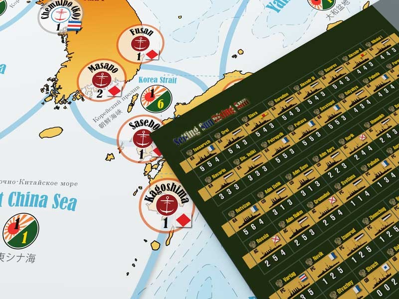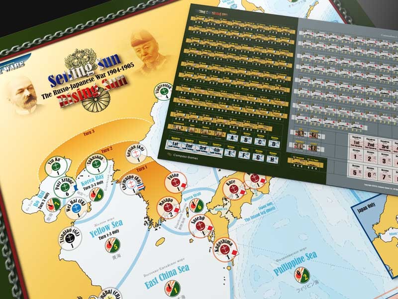 SETTING SUN, RISING SUN is an uncomplicated war game centered on the naval aspects of the Russo-Japanese War of 1904-1905. The game depicts this conflict at a strategic level, with most operational and tactical details represented by fast and easy-to-play systems, rather than intricate mechanisms. The intent of the game is to provide a broad overview of the historical events while being fun to play. The object of the game for the Japanese player is to control the sea areas around Japan to prevent Russian combatants from bombarding and cutting off supplies to the island nation, and to destroy the naval forces of Russia. The object of the game for the Russian player is to disrupt Japanese sea control, retain sea control around the Russian and Manchurian coastline for as long as possible, and destroy Japanese naval forces. Both players must obtain their objectives by deploying their naval resources into the sea areas on the map, earning victory points at the end of each of six turns for areas under their control, and for opposing units destroyed. SETTING SUN, RISING SUN owes its original inspiration to WAR AT SEA, designed by Jon Edwards and Don Greenwood and published by The Avalon Hill Game Company, a game which covered the war in the Atlantic in World War Two. SETTING SUN, RISING SUN borrows a number of concepts from this earlier game as a starting point, such as area movement, individual capital ships, battle line resolutions, and rolling sixes to hit, and then diverges significantly to reflect the Russo-Japanese War situation. The game includes about 280 counters, a 22"x28" map sheet of the combat areas including charts and tables, and a set of rules to play the game. Design by Stephen Newberg.