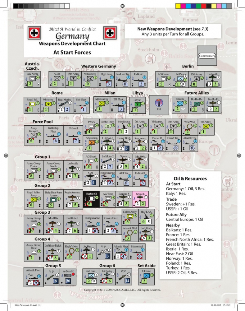 In each Blitz! turn, first the Axis and then the Allied players take turns performing activities. First you move out your naval and air units to sea, and resolve all sea area combats. It's possible for both sides to have units in the same sea area when a sea area combat is over. After moving your land and air units (except those at sea), you then launch your land area attacks. These include both ground attacks aimed at controlling a land area (unlike sea areas, only one side will control each land area when combat is over) as well as air attacks that bomb enemy ports and factories. Both sides may then perform an optional second round of activites exactly as before, but this time each major power needs to spend Oil in order to participate. Lastly, players resolve turn end activities together, including neutral entry, building and repairing units, and awarding Victory Points. When one or more major power has 15 VPs, the game is over and the victorious player(s) are determined.