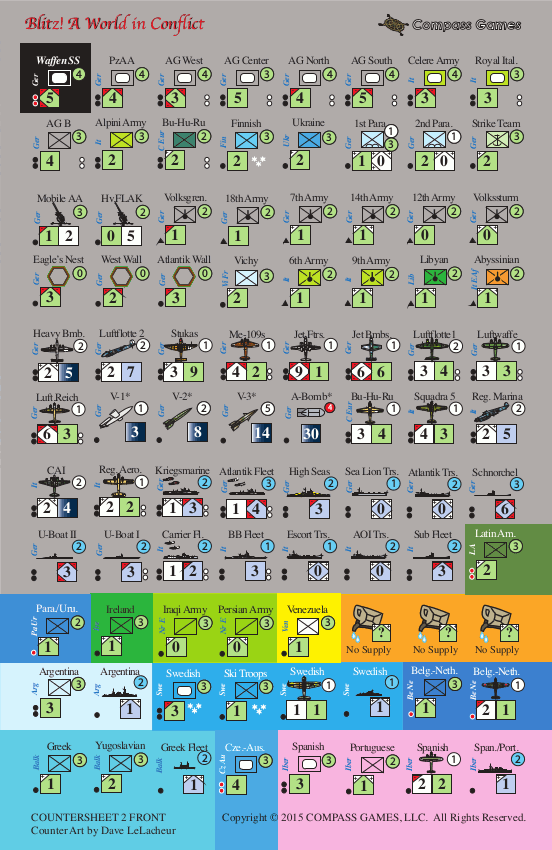 Blitz! A World in Conflict merges all of the fun of a wild all-out attacking beer-and-pretzel game together with the proven accuracy of World in Flames™. Players do all of the fun things (build your forces and attack!) but little of the work that historical games usually require. Quick rules for veterans gamers (<1 page) will have experienced gamers up and running in minutes.