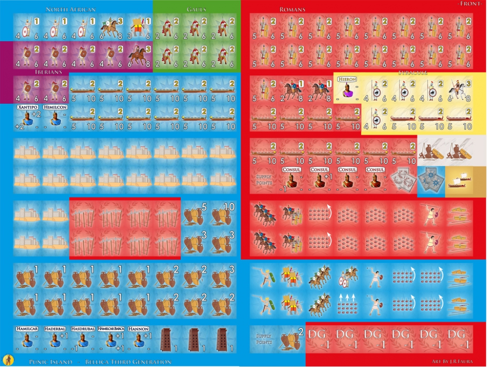 The game is developed in an operational scale – area-based map. It is designed for two players with one running the ROMAN forces and the other the CARTHAGINIAN forces -including Syracuse. The game lasts approximately 3-4 hours and uses a two sided system to handle the mechanics of play: cards and counters. The players will have to use their troops and their resources to obtain victory points while eliminating enemy forces and occupying cities in the map. It is not a card driven game as the cards are used to bring about events that influence battles, secure reinforcements, and provide resources with which to carry on the fight.