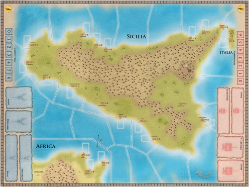 The ROMAN player will be on the offensive during the whole game as he has to conquer the whole island to get victory. CARTHAGINIAN player focuses on spoiling Roman campaigns and plans with ambushes, sallies and bad weather cards. Also he has to recruit an army as he doesn´t has any at the beginning of the game.
