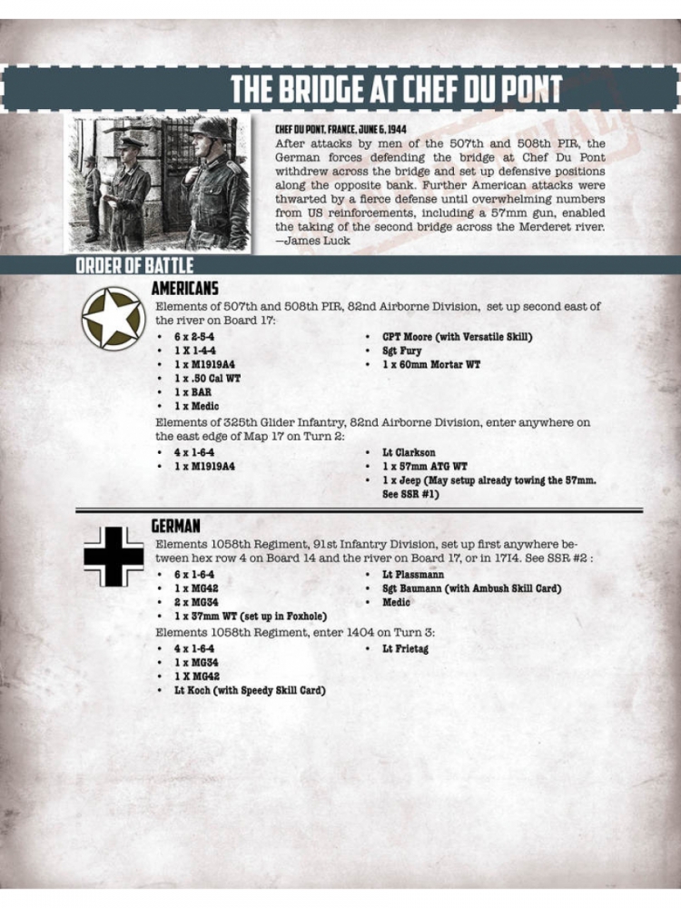 Heroes of Normandy has 30 scenarios and tell the battles of the men from the 101st Airborne, 82nd Airborne, British 6th Airborne, 17th SS Panzergrenadier, 6th Fallschirmjager, 91st Airlanding and 352nd Infantry Divisions. The scenarios covers battles spanning the D-Day drops, fighting the Norman hedgerows and Operation Market Garden.