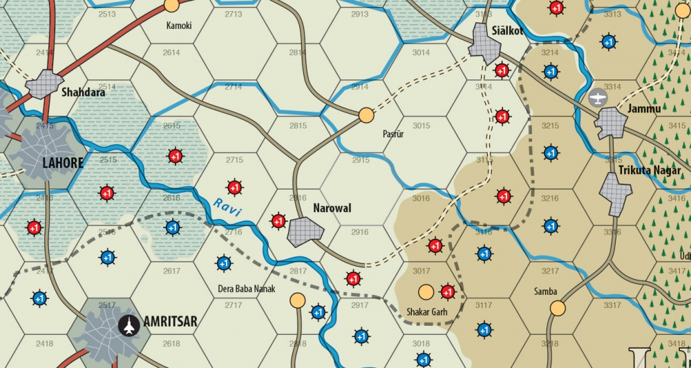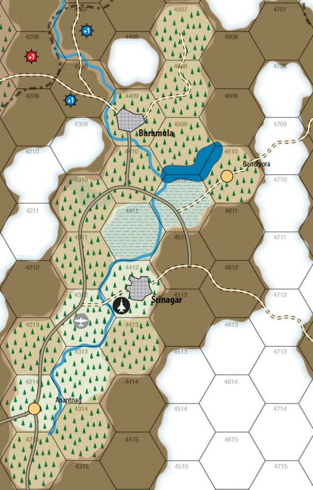 Due to the nature of a potential conflict, only a portion of the Indo-Pakistani border is featured so that the fighting centers around what it always has: the fate of the Indian state of Jammu & Kashmir. Special rules govern such things as the expanded role bridges play in the region play as well as the fact that both sides in the conflict are nuclear-armed nations. The People's Republic of China and the United States can make an appearance, but they might withdraw in the event of a nuclear exchange. The question is: will this war settle once and for all who will control northwest India?