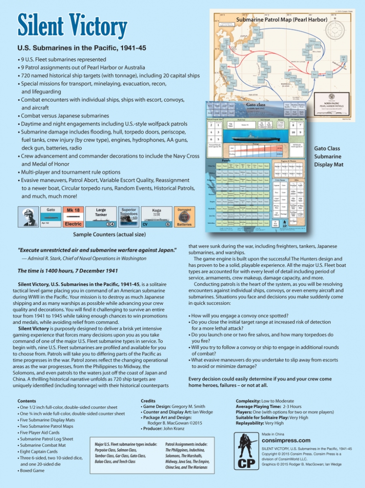 Silent Victory is a solitaire tactical level game placing you in command of an American submarine during WWII in the Pacific. Your mission is to destroy as much Japanese shipping and as many warships as possible while advancing your crew quality and decorations - all while remembering you have to make it home.