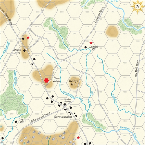 Germantown uses the simplified QuickPlay version of the Musket & Saber system of warfare during the muzzle-loading era. Combat is based on unit quality rather than raw numbers, and rewards use of historical tactics. All units are susceptible to rout when weakened, so players must maintain reserves. Leaders enhance unit capabilities. Special rules cover the characteristics of eighteenth century warfare, especially the emergence of light infantry, and the differences between regulars and militia. Winning the battle depends on deployment, thoughtful maneuver to concentrate at the key points, the proper coordination of arms, careful use of leaders and special units, and an understanding of the strengths and weaknesses of each army.