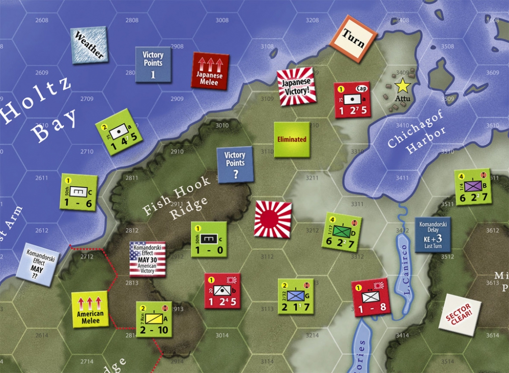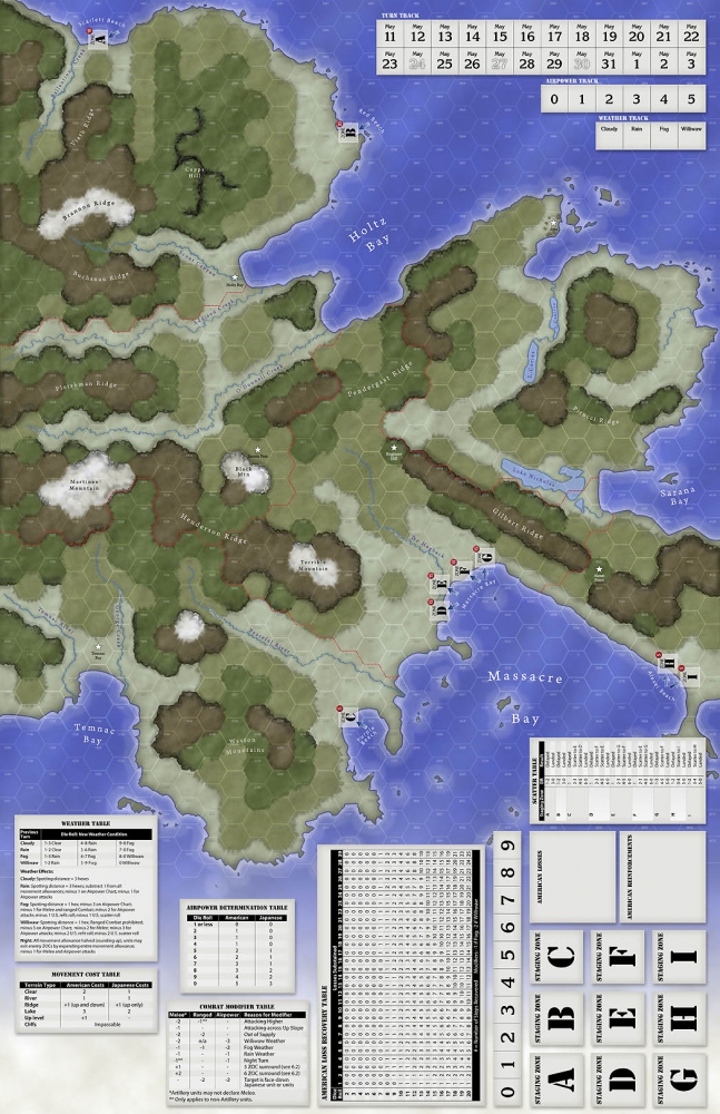 War in the Wind is a low-to-moderate complexity game (roughly eight pages of rules) depicting the brutal combat and conditions on Attu. The design focuses on the challenges faced by the American forces in the form of extremely variable weather conditions and logistical hurdles posed by nearly insurmountable terrain. The Japanese must use these conditions to their advantage in order to survive the overwhelming American numbers.