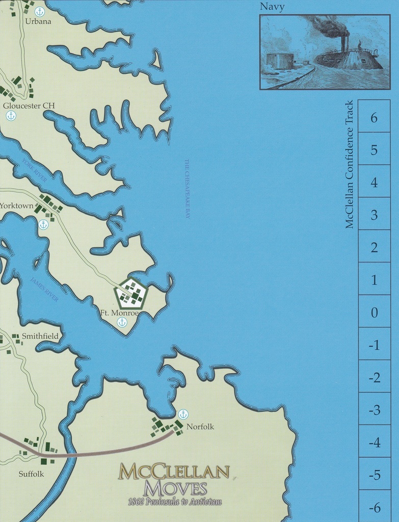 McClellan Moves expands Grant's Gamble, allowing players to recreate the Peninsula Campaign. Included in this game is units for Johnston, McClellan, siege guns, and the CSS Virginia.