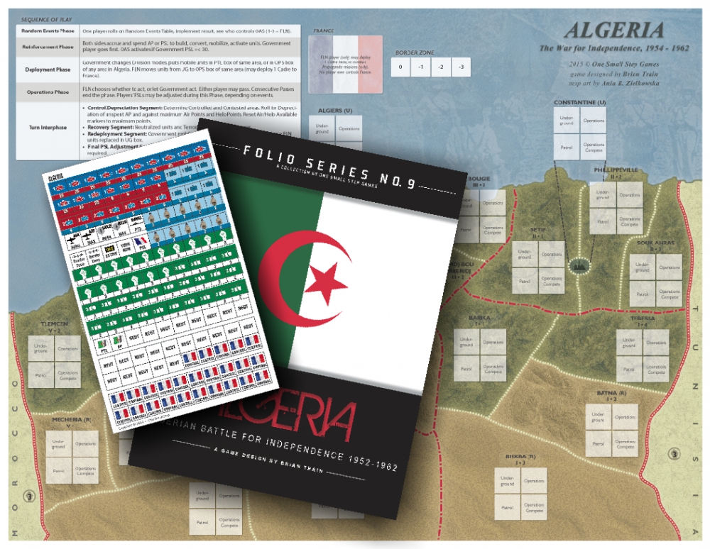Algeria is a game simulating the conflict between the FLN Arab nationalist guerrillas and the French government from 1954 to 1962. During the game, the FLN player tries to erode the authority of the French colonial authorities and replace their governing structures with his own, to the point that Algeria makes the transition from being the 10th department of France to national independence.