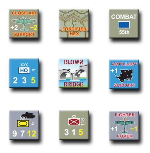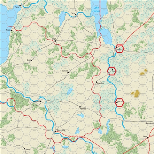 The map area portrays the Leningrad region of the Soviet Union, encompassing about 600 miles from east to west; each hexagon is about 12.5 miles. The various game pieces represent the historic combat units, as well as all necessary chits to facilitate game play. Soviet combat units are primarily divisions, the German units are divisions and Kampfgruppen and are color-coded by nationality and command affiliation. Combat units may represent from 2,000 to 14,000 men, and 50-400 armored vehicles.