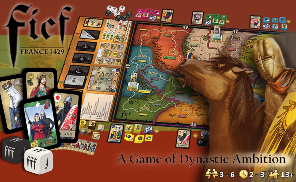 Fief: France 1429 is a game of dynastic ambition in which players assume the roles of nobles in the 15th century kingdom of France. Each player strives to become the most powerful ruling force in the kingdom by gaining control of Fief and Bishopric territories. In turn, they acquire Royal and Ecclesiastical (church) titles which give their families influence to elect the next Pope and King. Players strengthen their positions by negotiating marriage alliances between their families, setting the stage for love, treachery and deception!
