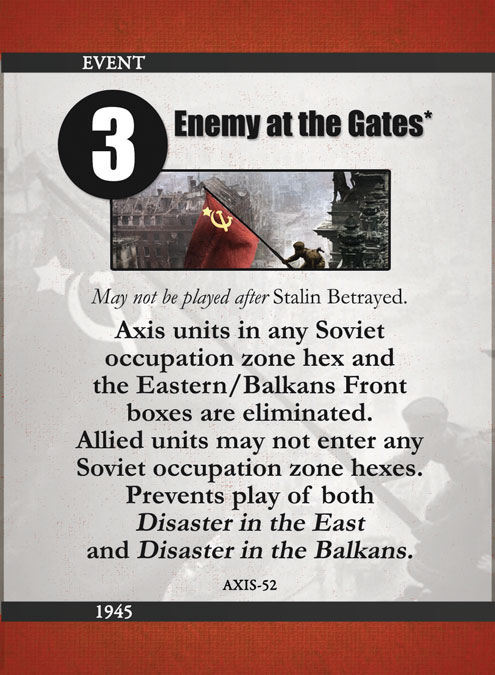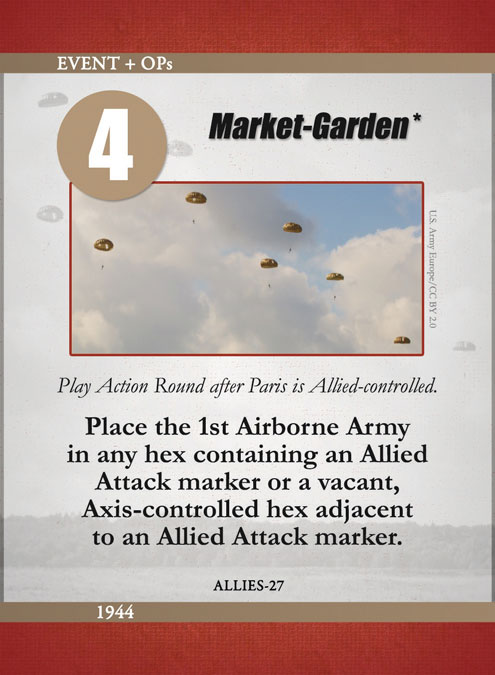 As the Allied player you must use your plentiful economic resources and military assets to successfully invade the European continent, defeat the Axis powers, and liberate Central Europe before it is occupied by the Soviet Union. As the Axis player you must use the advantage of interior lines and the tactical skills of the German Army to stubbornly delay the Allies, prevent them from occupying German soil, and potentially frighten them into signing a separate peace to prevent a communist takeover of Central Europe.