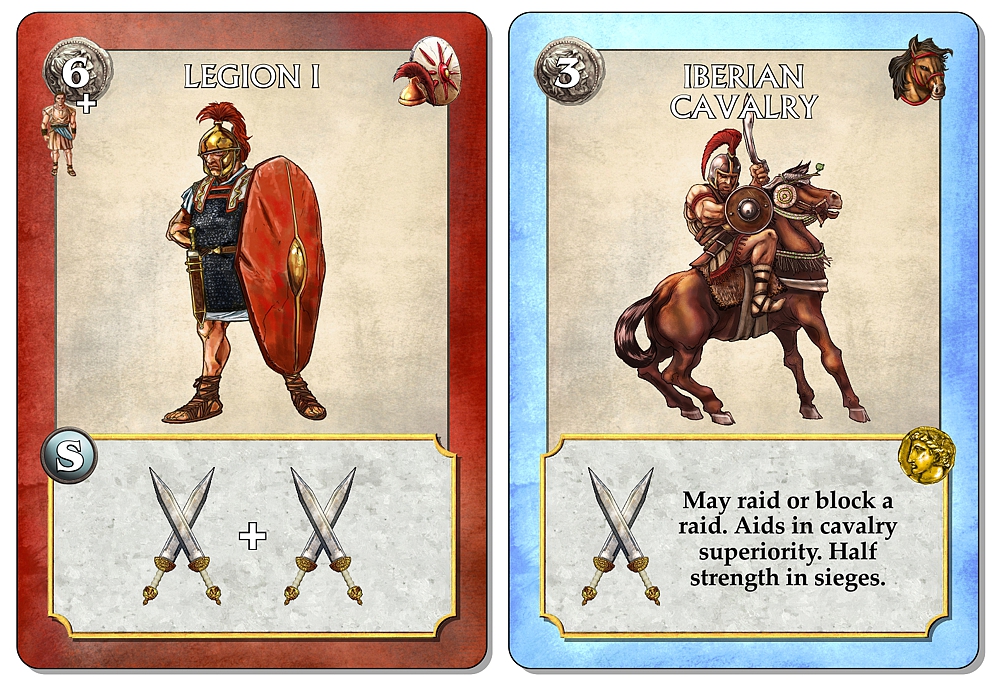 Each player has a starting deck of cards they use to perform various actions, up to two per round. Actions range from colonization, to naval movement, to battle, with most activity centered in and around Sicily and Sardinia/Corsica. Players may also purchase additional cards from their own custom decks, or from a set of neutral cards that either player may purchase. There are also Strategy cards that each player can purchase (one, max) that give the owning player some special advantage.