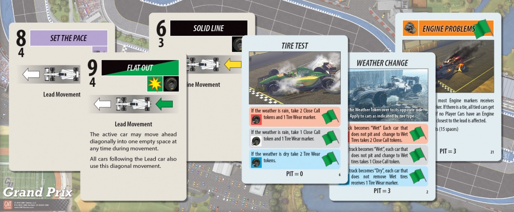 Grand Prix comes with three Event Decks, one for hard tires, one for soft tires and one for wet tires. Each set of cards have unique effects on the race. Hard tires make the game a bit slower and tighter with less pure speed and handling to get past opponents. The soft tire deck allows everyone to open up the throttle and go. Racing on wet tires can make things much more hazardous for everyone as spinouts and contact becomes more frequent.