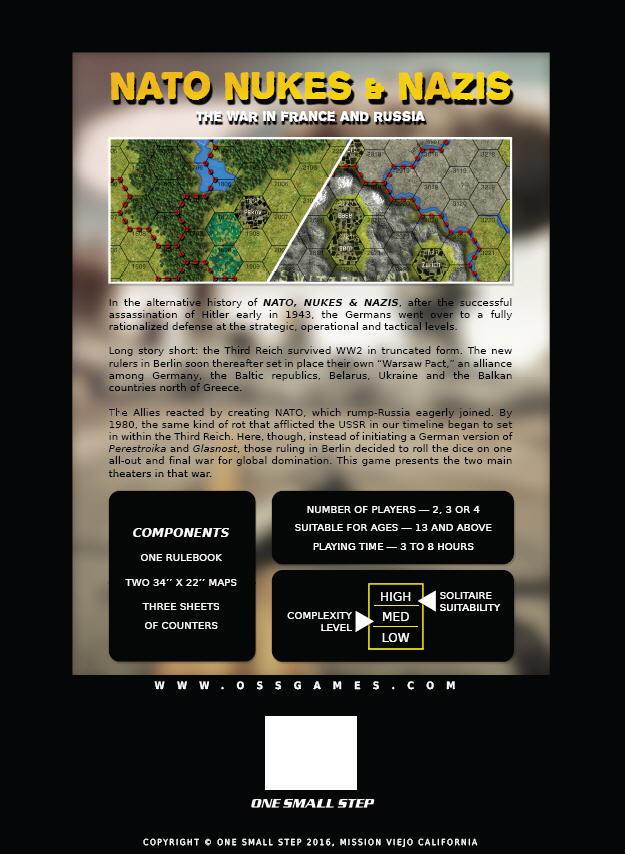 The successor to XTR's classic NATO, Nukes, and Nazis, this new version is a "What If" two-map mini-monster wargame set during the late-1980s in an alternative universe in which the Nazi regime survived World War II and is set to start World War III.