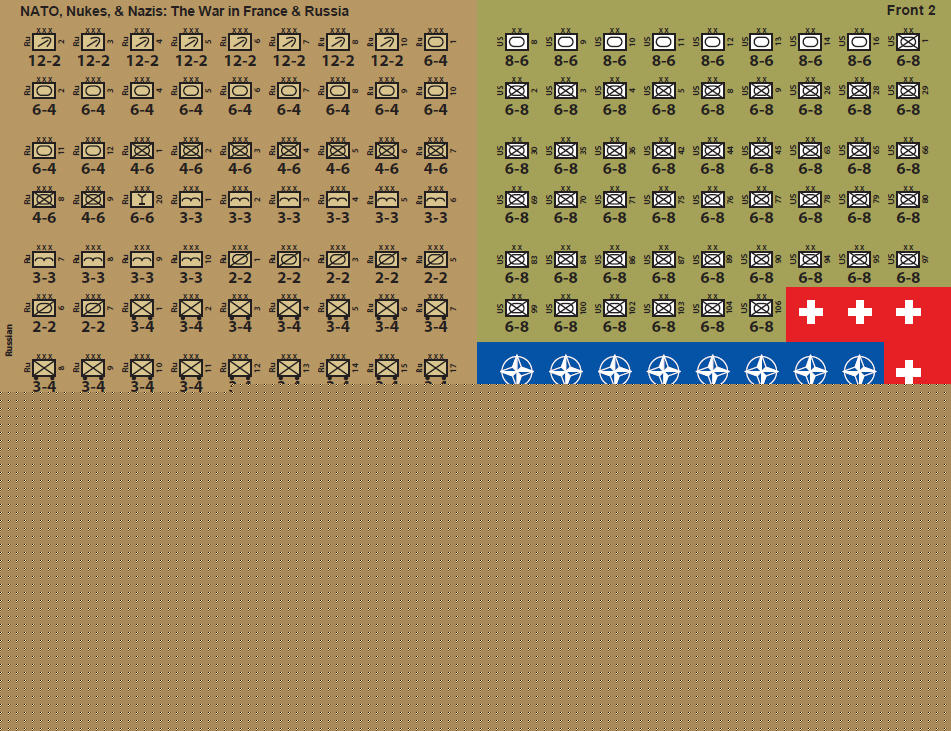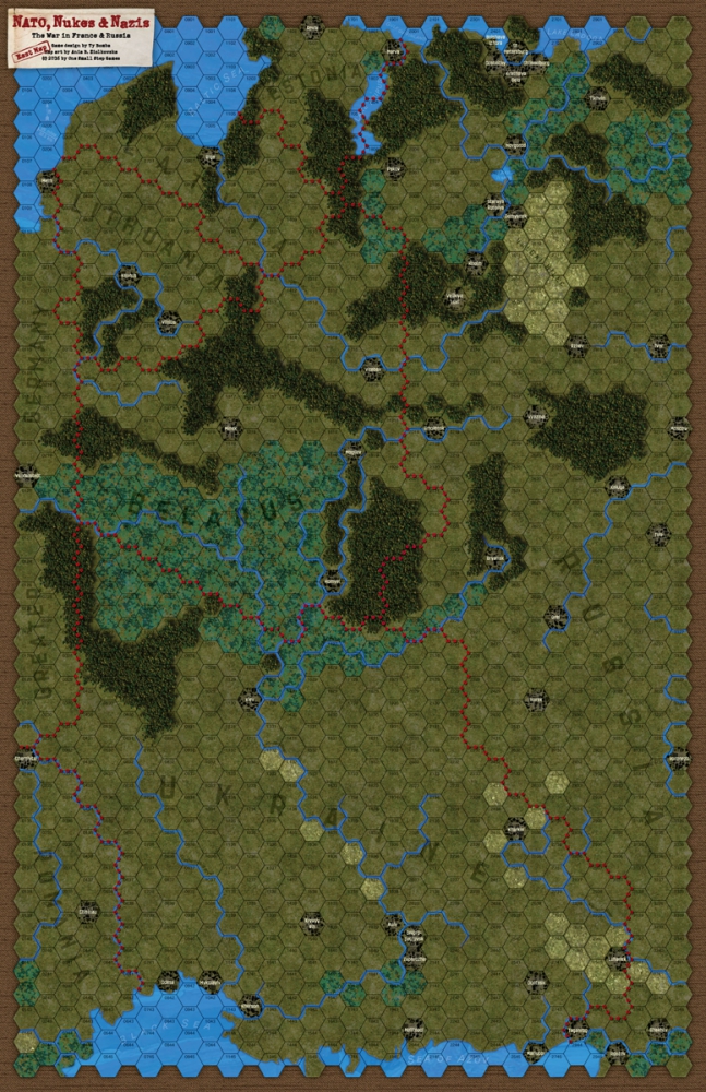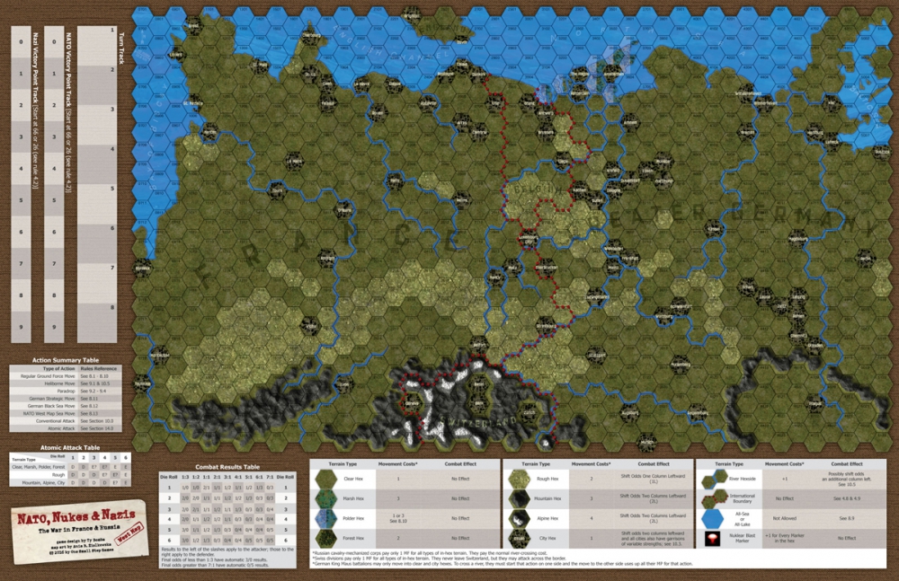 The initiating change to history behind this game is as follows. Early in the spring of 1943, one of the historically failed assassination plots attempted against Hitler during that period actually succeeded. In short, that allowed the German high command to go over to a fully rationalized defense at the strategic, operational and tactical levels. Long story short: the Third Reich survived WW2 in truncated form (see the maps). The new rulers in Berlin soon thereafter set in place their own "Warsaw Pact," an alliance among Germany, the Baltic republics, Belarus, Ukraine, and the Balkan countries north of Greece. The Allies reacted by creating NATO, which rump-Russia eagerly joined. By 1980, the same kind of rot that afflicted the USSR in our timeline began to set in within the Third Reich. Here, though, instead of initiating a German version of Perestroika and Glasnost, those ruling in Berlin decided to roll the dice on one all-out and final war for global domination. This game presents that war (or at least the two main theaters within it).