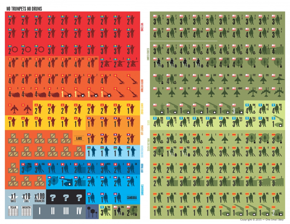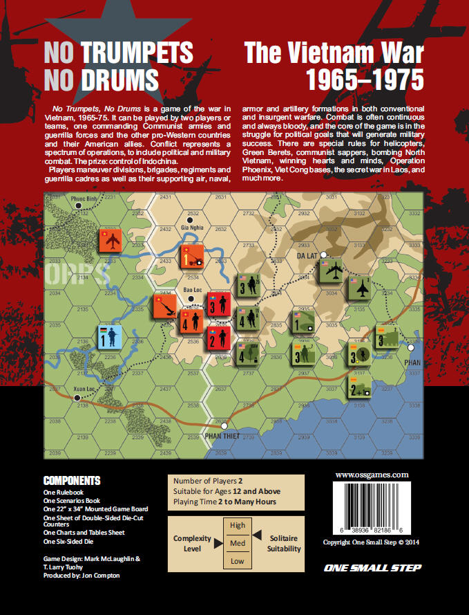 No Trumpets, No Drums is a game of the war in Vietnam. Two players or teams representing the Communist states and guerrilla armies of Southeast Asia and the pro-Western and neutral states and forces of that region and their American allies combat each other in a political and military duel for control over Indochina.
