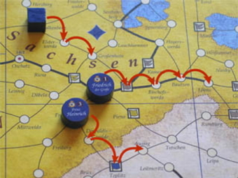 So in the game FRIEDRICH for 3 or 4 players: All against one. But only one will reign supreme. On a map of Old Europe, players manoeuvre their generals from city to city. Frederick must retain a part of each Prussian province, while the attacking powers savagely seek out their objectives. The clever use of tactical cards is decisive to winning.