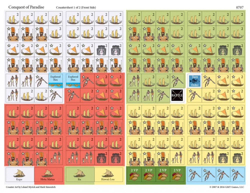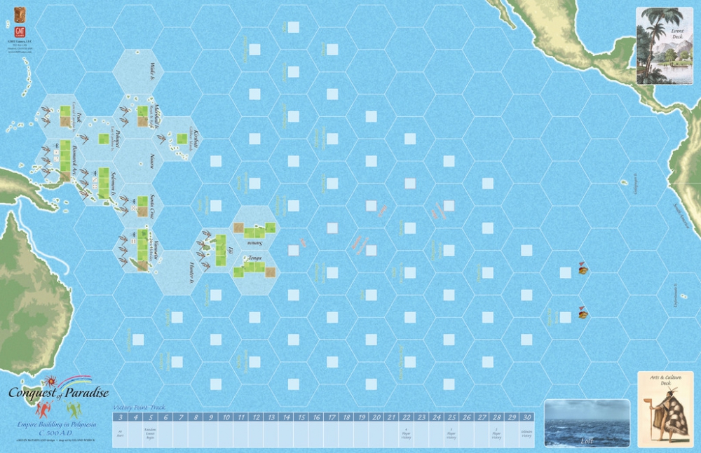 Conquest of Paradise is a game of empire building in the "Polynesian Triangle" of the central Pacific Ocean for two, three, or four players. Players explore the unknown ocean around them, hoping to discover the most lucrative island groups, and colonize them. They build canoes and train warriors to create a force to defend their empire, while forging lines of communication with their developing discoveries. Resources are scarce; using them wisely is a key to victory. Investing in exploration widens your empire. Building warriors strengthens your empire. Investing resources into cultural innovations can yield unexpected dividends, like tattooing, hula dancing, surfing, or even the giant moai statues of Easter Island fame.