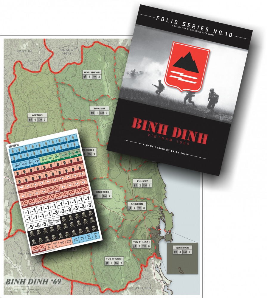 Binh Dinh '69 is a simpler game (than Green Beret Folio No. 2) on insurgency in this coastal province of Vietnam in 1969. The game was originally designed for use in a university history course on 20th Century violence. It uses a topic-specific system rather like Green Beret's but taken up a notch, with a bucket-of-dice combat resolution method. Like all folio games so far, 17x22" map and 140 double-sided counters are included.