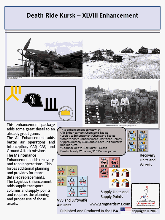 The XLVIII PzK Enhancement package builds on the detail of the game system. Those who own the original games will recognize some of the counters in this package as those from the Maintenance, Logistics, and Air Enhancements. They have been bundled together similar to the ones from the IISS PzK Enhancement package.