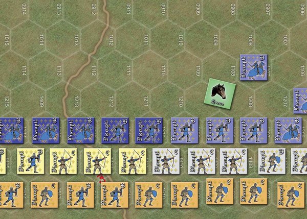 "We Happy Few" recreates one of the most famous battles of the Middle Ages by using the basic skeleton of the S&S system seen in such titles as Flying Pig Games’ "Stamford Bridge" and "A Hill Near Hastings", with important modifications to better suit both the later era and this specific battle. Chief among these is a clever, speedy, and diceless alternative to opportunity/reaction fire concepts that reflects the difficulties inherent in moving under missile fire. This results in a very tough game for the French Player. The English Player is favored to recreate the historical result, but it’s not a stroll in the park.