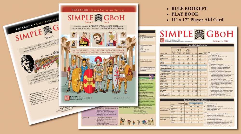 Simple Great Battles of History (Simple GBoH) allows gamers to recreate the significant battles of the ancient Western world covered by GMT's Great Battles of History (GBoH) Series. Simple GBoH is designed for players who want a faster, less die-roll-heavy version of the GBoH system, while retaining as much of the historical flavor and insight of the original rules. These rules and its companion playbook cover all the battles published in Deluxe Great Battles of Alexander, SPQR, Caesar: The Civil Wars, Caesar: Conquest of Gaul, Cataphract, and all their related modules. The battles presented in C3i are published in the Simple GBoH Battle Manual.
