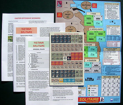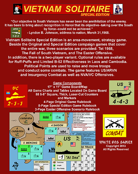 Vietnam Solitaire Special Edition is an expanded edition of the original Vietnam Solitaire that contains both the original game (with all new artwork) and a reimplementation by Steve Kling with expanded rules, new scenarios, and new counters. While primarily a solitaire game, the special edition also contains optional two player rules.