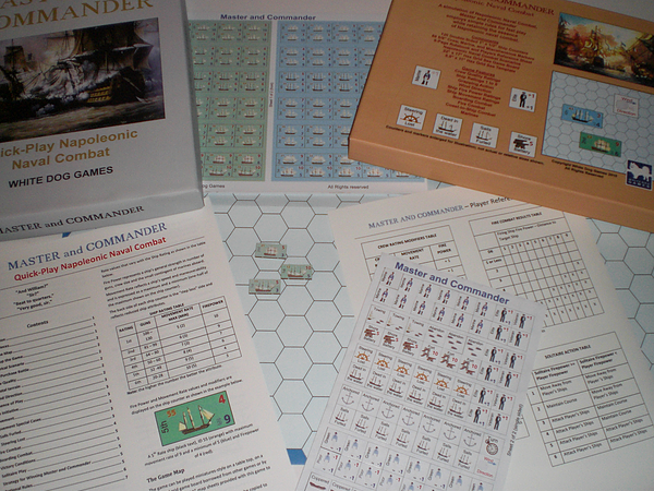 Master and Commander is a simulation of Napoleonic naval combat. Simple rules are employed for fast play while still retaining the essence of Napoleonic naval combat. Players can chose to play an historical scenario, a free purchase battle or a duel. In a free purchase game, each player starts with 50 Ship Purchase Points and spends those points to build a fleet. A ship costs an amount equal to its Fire Power value. For play variety, players can set up coastal terrain with Fort and Shore Battery markers along map edges. Players determine the wind direction before the game begins.Three historical scenarios are included with the game.