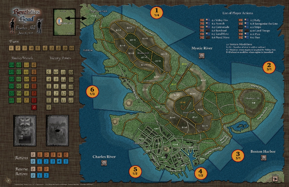 These two battles present two entirely different tactical conflicts. In Boston to Concord players range far and wide performing a variety of actions while engaging in minor skirmishes and only occasionally pitched battle. Bunker Hill is nothing but one long and bloody pitched battle with American reinforcements trickling in every turn as the English juggernaut bears down on their objectives. The actions that are available to players are varied by game which allow for the tactical differences of the two conflicts while maintaining a central game structure for both games.
