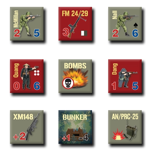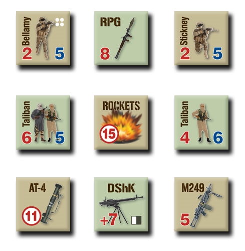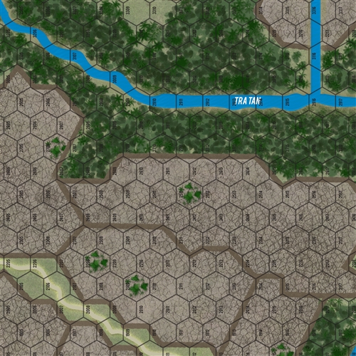 Combat Veteran is a simple two-player tactical combat system that simulates the dynamics of infantry combat at the individual (man-to-man) level. This game features two particular historic scenarios as the introduction to the wider system: Firefight at the Rice Paddy Angle (Vietnam in Mekong region, 1967), and Firefight at Combat Outpost Keating (Afghanistan in the Nuristan Province, 2009). Both firefights involved about a platoon of US infantry against a numerically superior enemy force. The US and Viet Cong game soldier game pieces represent specific, individual men of their respective units, whereas Taliban soldier game pieces represent three to six men. Each hex represents about 40 meters of actual terrain (almost half a football field from hex corner to hex corner), and the entire map area is roughly the same acreage as Hyde Park in London. Each weapon game piece represents one specific type of named weapon and its standard loadout. For example, the M60 weapon game piece represents one M60 machinegun, at least a 150 rounds of ammunition, and presumably a spare barrel (and even an asbestos glove), etc.
