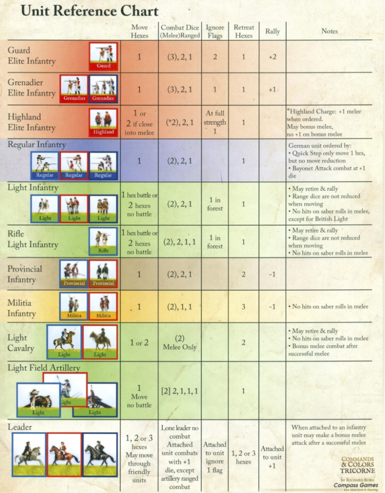 Players, that are familiar with other Commands & Colors games, will soon note that unit combat losses in a Tricorne game are typically not as great as other games covered in the Commands & Colors series. This is a direct result of the linear tactic fighting style of the armies that fought during the American Revolution. Unit morale is the main thematic focus in a Tricorne battle as it was historically. Knowing that an entire unit, that has only taken minimal losses when forced to retreat, may actually break and rout from the battlefield, will definitely keep players on the edge of their command chairs during an entire battle.