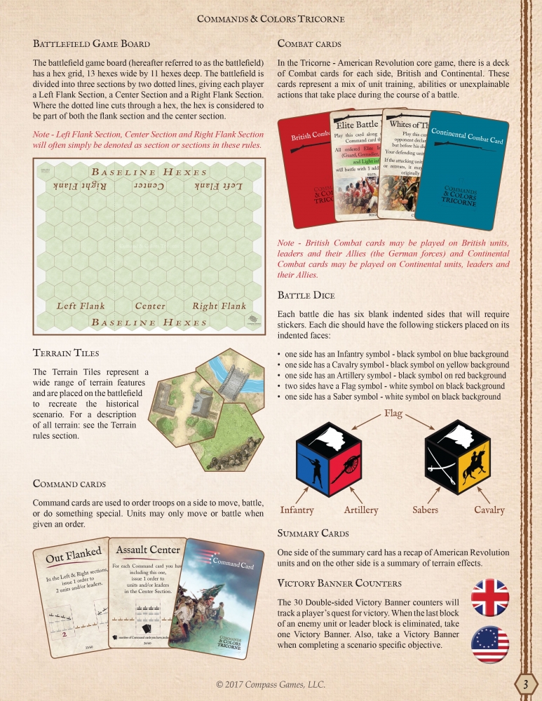 By design, Commands & Colors Tricorne - The American Revolution is not overly complex. The game is based on the highly successful Commands & Colors game system, where the Command cards drive movement while creating a “fog of war” and the battle dice resolve combat quickly and efficiently. Commands & Colors Tricorne - The American Revolution, however, introduces many new game concepts, which will add historical depth and provide even the most veteran Commands & Colors player many new play experiences and challenges.