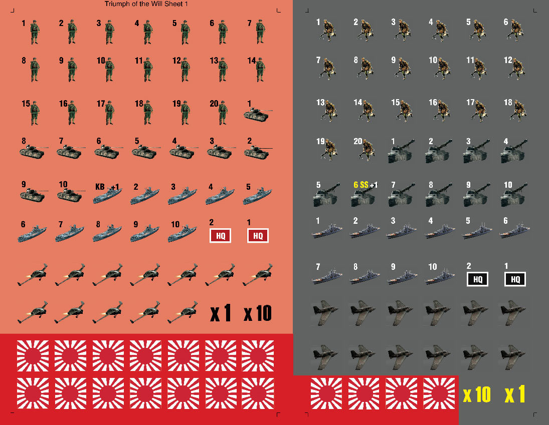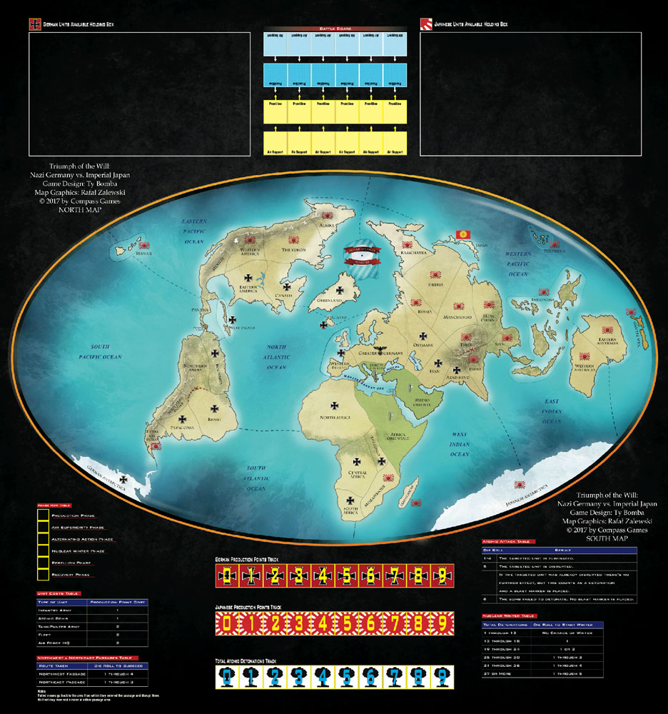 Triumph of the Will: Nazi Germany vs. Imperial Japan, 1948 enables two players to game the entirety of alternative history’s worst nightmare: a triumphant Nazi Germany and Imperial Japan, having won World War II and conquered the planet in 1945, square off against each other – for total domination – three years later. The game’s two area-movement mapsheets join along the equator to show the whole world, including the Arctic and Antarctic.