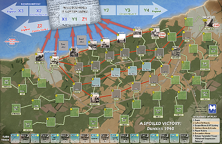 A Spoiled Victory is a solitaire game designed by Paul Fish and Hermann Luttmann that challenges the player with making decisions similar to what the British command was required to make during the evacuation at Dunkirk in May-June of 1940. Points are allocated each turn for defense of the perimeter, creation of evacuee units, and moving evacuees from the beaches to the safety of England. You cannot save them all, so you must pick who will stay and fight and who will escape to fight another day. The level of victory or defeat is measured by the number of troops and the amount of equipment that is saved through evacuation.