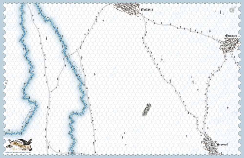 At Mollwitz (April 10, 1741) King Frederick II has been outmaneuvered by FM Neipperg. The plodding Prussians must advance over snowy fields to assault the waiting Austrian infantry and escape the entrapment. The Austrian player, with superior cavalry, must use that cavalry to slow down or distract the Prussian infantry before they devastate their Austrian counterparts. Each side has their strengths (and weaknesses) and must seek to maximize them to their benefit before time runs out. And, there is always the possibility that Frederick will flee the battlefield...