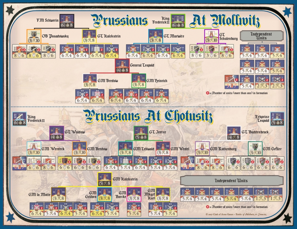Both battles are one map in size with less than the usual number of counters. Chotusitz is roughly the size of the BAR game of Lobositz whereas Mollwitz has only 2/3 of the counters of Chotusitz.