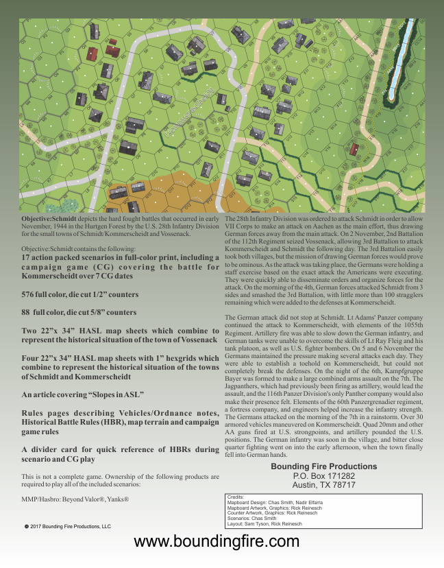 Four 22"x 34" HASL map sheets with 1" hexgrids which combine to represent the historical situation of the towns of Schmidt and Kommerscheidt