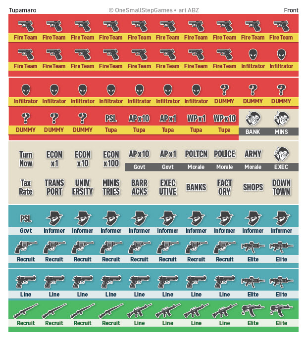 For his part, the Government player can Build and Train his forces. Training takes time and resources but upgraded troops are more effective and avoid the penalty for using untrained recruits. The government player can divide his security forces between a passive role of Guarding the streets, and an active role of Cordon and Search missions to capture or eliminate insurgents and possibly rescue kidnapped Public Figures. He can also fight a semi-covert campaign of placing Informers and running Intelligence missions to reveal Tupamaro units and eliminate Infiltrators.