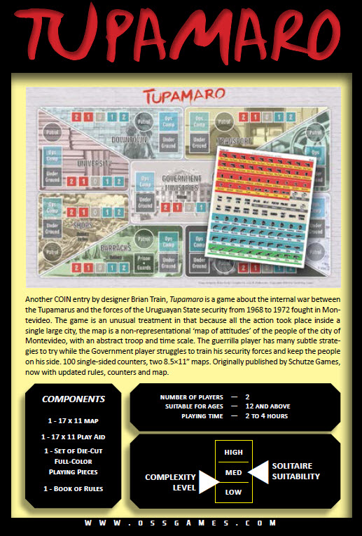 Another COIN entry by designer Brian Train, Tupamaro is a game about the internal war between the Tupamarus and the forces of the Uruguayan State security from 1968 to 1972 fought in Montevideo. The game is an unusual treatment in that because all the action took place inside a single large city, the map is a non-representational 'map of attitudes' of the people of the city of Montevideo, with an abstract troop and time scale. The guerrilla player has many subtle strategies to try while the Government player struggles to train his security forces and keep the people on his side.