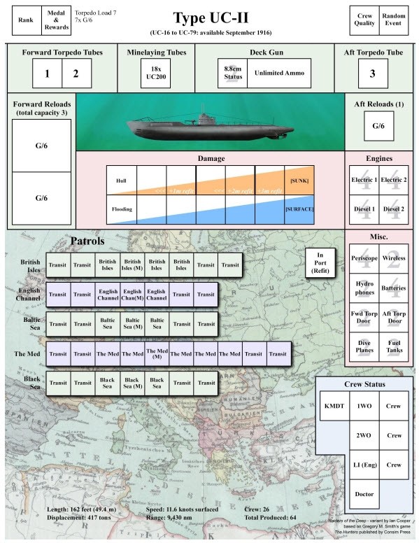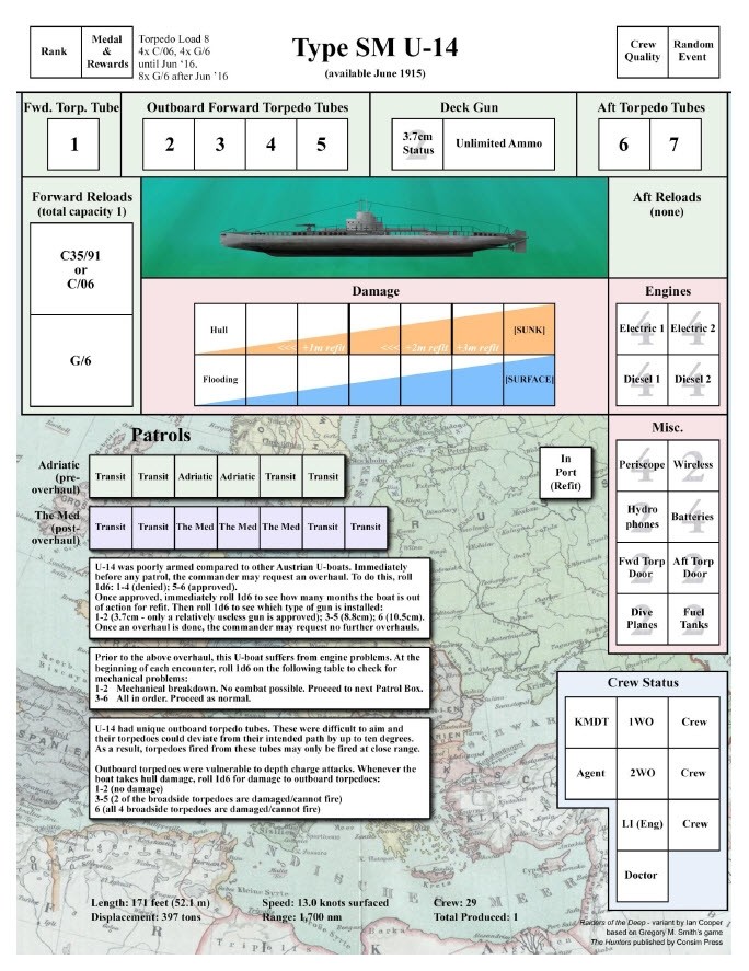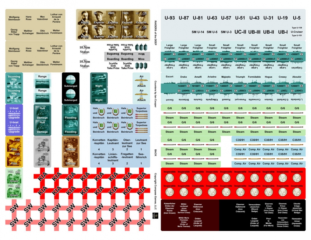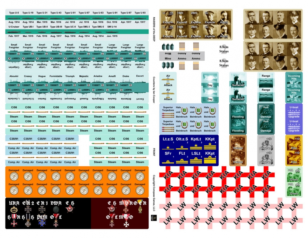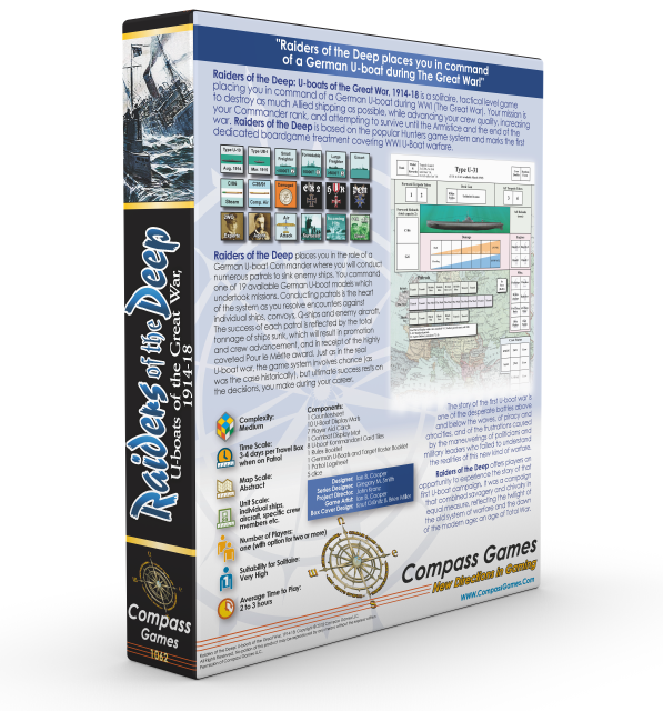 Raiders of the Deep: U-boats of the Great War, 1914-18 is a solitaire, tactical level game placing you in command of a German U-boat during WWI (known at the time as The Great War). Your mission is to destroy as much Allied shipping as possible, while advancing your crew quality, increasing your Commander rank, and attempting to survive until the Armistice and the end of the war. Raiders of the Deep is based on the popular Hunters game system by Gregory M. Smith and marks the first dedicated boardgame treatment covering WWI U-Boat warfare.