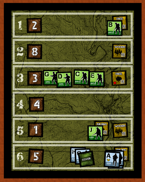 Rifles in the Ardennes recreates the tense action that characterized Ardennes in a unique single-player format. Designer and Artist Gottardo Zancani has replaced the literal map typical of World War II games with a stylized track, allowing for endless customization of the battlefield.