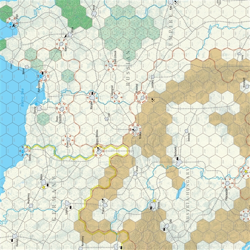 The map covers the entire war zone in Europe (36 miles per hex) and the Middle East (at a slightly larger scale). Terrain includes key cities, certain cultural and religious sites, primary railroads, and sea zones connecting it all. Counters represent field armies, with some specialized corps and a few markers. Six month turns keep the game playable, while multiple movement and attack phases allow for operational nuance.