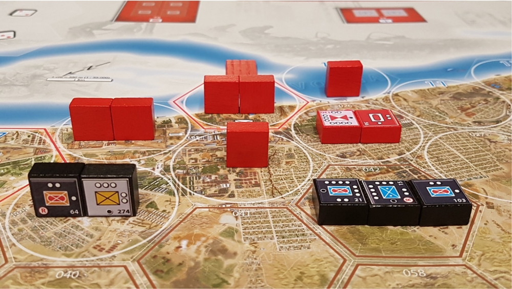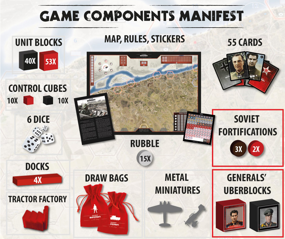 The wooden-block units in the game represent regiments for the Germans (with some assault battalions) and brigades/divisions for the Soviets.