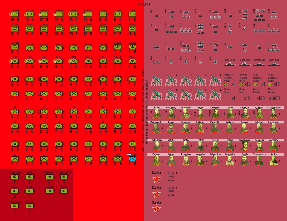 LEBENSRAUM! is a grand strategic, moderate complexity game of the war between Nazi Germany and the Allied Nations, starting with the German invasion of the USSR in late June of 1941, through to the final battles to Berlin in 1945. The game includes both East and West Fronts, and can be played in a number of small (3 to 13) turn historical scenarios starting with Barbarossa in the East and Italy in the West, or in campaigns for each front individually, or a combined East and West front campaign.