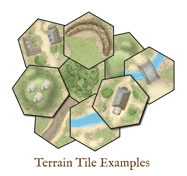 3 Terrain and Accessories punchboards containing (these are the thick tiles that have been so well received by players), totaling 45 Double-sided Terrain Tiles and 18 Double-sided Victory Banner counters